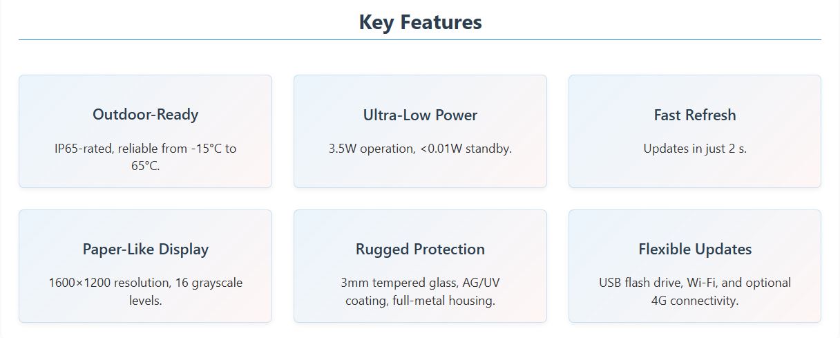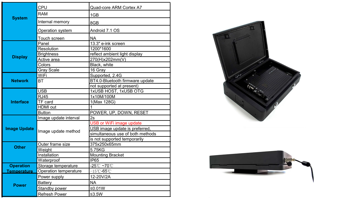 13.3" E-Ink RTPI display with 1600×1200 resolution and wide temperature range (-15°C to 65°C).
